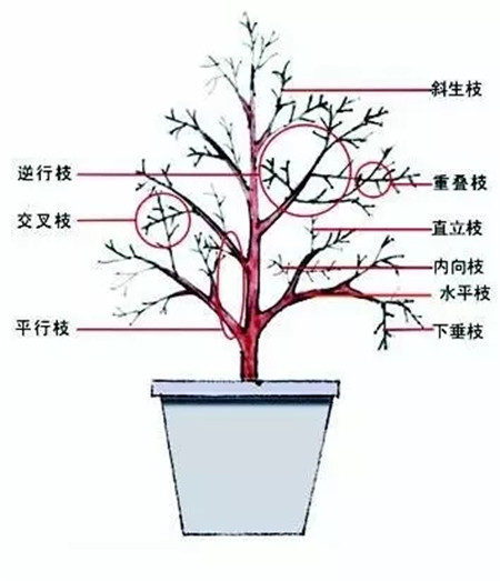 下图列出的交叉枝、重叠枝、下垂枝都要剪掉~